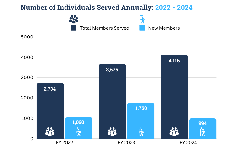 In FY 2024 we served 4,116 individuals, 994 of whom were utilizing our services for the first time.